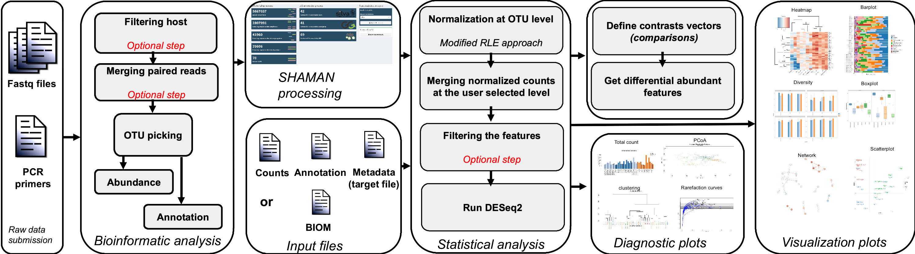 The bioinformatic treatment of fastq reads is now available in SHAMAN. For now, SHAMAN allows to compute OTU, build an OTU table and annotate them with the last version of the available database. This application is for 16S/18S/23S/28S/ITS sequencing.